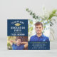 Celebra a tu graduado con estilo moderno con esta invitación de fiesta de graduación que presenta un diseño azul marino audaz, un icono de gorra de graduación dorada y dos espacios para fotos para un retrato de graduado y una imagen adicional. La tipografía limpia destaca “Fiesta de Graduación”, el nombre y el año de graduación. Ideal para una celebración en casa o en un espacio abierto y fácil de personalizar.