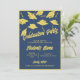 Una invitación de personalizable azul marino y oro para una fiesta de graduación. Personalice la parte delantera de estas invitaciones a graduación con el nombre del graduado y la información de su fiesta. Personalizar la parte de atrás de la invitación para graduarse con una foto del graduado, el año de graduación y la escuela. Tapones de graduación de oro y morteros arrojados en el aire sobre un fondo azul. Invitación divertida a una fiesta de graduación para graduaciones de secundaria o universitarias.