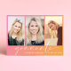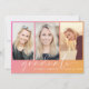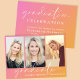 Invitación a una fiesta de graduación a la moda con fondo de degradado rosa a naranja, tres fotos del graduado, "graduada" con un guion blanco moda y su nombre y año de clase con una simple tipografía blanca moderna. Añada los detalles de su fiesta al dorso.