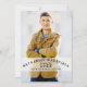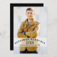 La tipografía moderna quebradiza se ofrece en esta invitación/invitación de la graduación que mezcle estilo masculino con líneas limpias contemporáneas y una sensación del equipo universitario. Con su nombre personalizado en texto curvado, y año de la clase y el nombre todo de la escuela en negro, las letras se fijan contra la perspectiva de la foto mayor vertical del retrato de su hijo en una banda transparente del blanco. En la parte posterior, todo el texto puede ser modificado para requisitos particulares. El uso como invitación a una fiesta de graduación (como se muestra) o cambia fácilmente el texto a una invitación solamente.