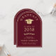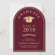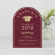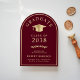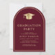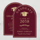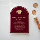 Elegante invitación de graduación universitaria de color rojo burgundy en forma de arco y tarjeta de invitación a la fiesta con gorra de graduación dorada y tipografía moderna y simple en dorado para el nombre del graduado, año de graduación, universidad o college, título y especialidad u honores. En el reverso, agregue los detalles de la fiesta de graduación.