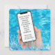 Mano sosteniendo un teléfono celular en agua salpicada con texto para una invitación del fiesta de la piscina de 21 años. Se puede cambiar todo el texto.