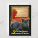 Gato negro con una expresión ligeramente diabólica frente a una escena luna llena de color otoñal. Texto "Estamos teniendo una fiesta de Halloween... ¡y estás invitado! Fecha, hora, ubicación, disfraces apreciados". Recuerde rellenar sus propias fechas.