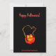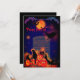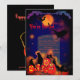 Invitación a la fiesta de Halloween que muestra lápida en cementerio con luna llena naranja amarillenta en cielo nocturno azul oscuro. Pájaros negros y cuervos, calabazas naranjas brillantes y gato negro en primer plano envueltos en niebla naranja. Texto frontal "You're Invited" en texto espeluznante naranja. Texto en la lápida con la información de tu fiesta. La parte delantera contiene adorno de borde de estilo gótico. La parte trasera de la invitación es un gato negro encima de una calabaza de Halloween brillante con texto en naranja "Happy Halloween". Fondo azul oscuro.