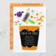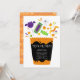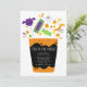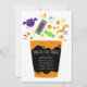 Esta encantadora y dulce invitación incluye una taza de fiesta llena de dulces de Halloween. Las palabras "Truco o trato" están escritas en un tipo de letra divertido y festivo. ¡Es la forma perfecta de invitar a los hijos de tus amigos a una aventura con trucos o trucos!