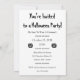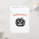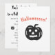 Invitación a una fiesta de Halloween linda y espeluznante con gráficos blancos y negros. La parte delantera tiene una calabaza negra y la palabra con ortografía intencionalmente incorrecta Halloweeeen en una fuente naranja espeluznante. El texto en la parte posterior dice "¡Estás invitado a una fiesta de Halloween!" en una fuente espeluznante. Puedes personalizar el resto del texto: "Asegúrate de usar un disfraz", fecha, hora, lugar, RSVP / número de teléfono. Dos versiones más pequeñas de la calabaza también están impresas en la parte posterior.