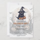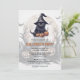 Una encantadora y espeluznante invitación a la fiesta de Halloween que incluye un gato negro en una mansión gorra, encantada, lámparas, murciélagos y la luna llena.