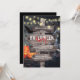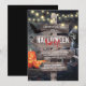 Invitaciones de fiesta de Halloween espeluznantes con una casa embrujada, calabazas, arañas, murciélagos, la parca, luces de cuerda y un letrero de madera rústica con la información de la fiesta.