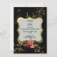 Esta elegante invitación de Halloween tiene decoraciones doradas sobre fondo negro. El marco tiene una forma geométrica elegante que incluye el texto que puede ser personalizado para su fiesta de Halloween o fiesta de Dia de los Muertos. Al final de la parte temática de Octubre, la invitación es un collage mágico acuarela de una lechuza, jaula de aves, equipaje, etc. La parte trasera tiene flores de oro a juego.