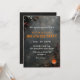 Invitación a la fiesta de Halloween para adultos con disfraces y cócteles. El diseño presenta un fondo oscuro, bosques, velas y cráneos. Artículos de fiesta de Halloween coincidentes en nuestra tienda. Personaliza tus datos.