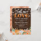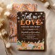Invitación a una fiesta de inauguración de casa de otoño campestre con un fondo de madera rústica, luces de cadena en el patio trasero, flores de acuarela elegantes de color naranja y blanco de otoño, la encantadora frase "enamórate de nuestra nueva casa", y una plantilla de fiesta de nueva casa fácil de personalizar.