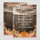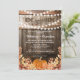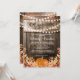 Invitaciones de fiesta de inauguración de casa de otoño rústicas con un fondo de barril de roble de granero rural, luces de hadas, hojas de otoño, una calabaza de cosecha y una plantilla de fiesta de hogar dulce hogar que es fácil de personalizar.