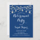 Invitación a la fiesta de jubilación. Diseño de estilo rústico en azul marino y blanco. Presenta el tipo de letra del guión y luces de cadena de hadas. Mándame un mensaje si necesitas más personalización.