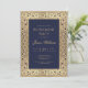 Esta elegante invitación a una fiesta de jubilación en azul marino y dorado con aire vintage tiene un marco floral dorado de decoraciones intrincadas de rosas silvestres sobre un fondo azul marino. Todo el texto se puede personalizar y tiene un color dorado similar al de las rosas doradas del marco. El nombre está escrito en una elegante letra caligráfica, el resto en mayúsculas.