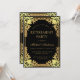 Esta elegante invitación a la fiesta de retiro en negro y oro con un aire vintage, recomendada para un hombre, tiene un marco de Relieve metalizado de imitación de oro ornamentado con elegantes decoraciones barrocas doradas sobre un fondo negro. El nombre está escrito en una caligrafía elegante. Todo el texto puede ser personalizado y tiene un color amarillo dorado similar al marco falso dorado. El marco vintage, ornamentado, se basa en un enlace de portada de libros antiguos franceses, de Georges Mercier (1885-1939) - Madame de Maupin por Teophile Gautier, edición 1911, ahora de dominio público.