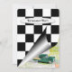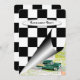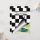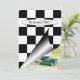 Esquina enrollada de bandera negra y blanca a cuadros con auto vintage para fiesta de retiro.