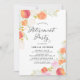 Invitación a la Fiesta de Jubilación de Melocotones y Flores de Acuarela. Invitación de fiesta de retiro de personalizable con escritura caprichosa y ilustraciones acuarelas de melocotones, peonías, eucalipto con otros acentos fológicos y florales. Esta invitación femenina y caprichosa es perfecta para eventos de primavera y jardín. Personalice agregando sus propios detalles de eventos. También puede hacer personalizar de la parte posterior de la invitación añadiendo su propia foto o patrón.