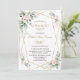 Diseño de tarjeta encantador con flores delicadas de color rosa suave en acuarela, hojas verdes aireadas y doradas, un marco dorado falso, divisor floral, sobre fondo blanco. Utilice la herramienta Personalizar para agregar su información. Para artículos coincidentes, visite mi Colección Floral Verde Dorado.