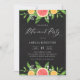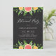 Invite a los invitados a su evento con esta invitación a la fiesta de retiro. Cuenta con ilustraciones acuáticos de pomelo, clementinas, flores de flores y vegetación sobre un falso fondo de pizarra. Esta invitación a los cítricos será perfecta para los fiestas del tema cítrico y de verano. Personalice agregando los detalles del evento.