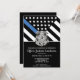 Este diseño presenta una bandera de la fuerza policial con franjas negras y blancas, y una franja de línea azul delgada también. La insignia de la policía y el texto plateado se encuentran sobre todos los detalles de la fiesta para el oficial de la ley en retiro, alguacil, capitán o jefe de la fiesta de jubilación.