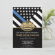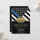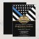 Este diseño presenta una bandera de la fuerza policial con franjas negras y blancas, y una franja de línea azul delgada también. El sombrero de policía y el texto dorado se sitúan encima de todos los detalles de la fiesta para el oficial de policía, alguacil, capitán o jefe que se jubila.