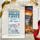 Invitación a la fiesta de jubilación con una imagen de puertas que se abren mostrando un camino con copos de nieve brillantes. La parte trasera muestra un diseño boho chic con un paisaje festivo y colorido. Las estrellas doradas estilizadas añaden un ambiente navideño. Hermoso para una jubilación a finales de año para celebrar lo que se ha logrado y dar la bienvenida a un nuevo año con nuevos comienzos en la vida.