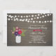 Celebra tu día especial con esta elegante invitación sorpresa. El diseño se caracteriza por las luces de cuerda, el ramo de flores de otoño con un frasco de albañil sobre un fondo rústico de madera. La paleta de colores es roja y violeta. Puede personalizar del texto a cualquier evento.