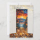Invitación a la fiesta de jubilación con una imagen de puertas que se abren mostrando un camino con copos de nieve brillantes. La parte trasera muestra un diseño boho chic con un paisaje festivo colorido. Las estrellas doradas estilizadas añaden una atmósfera navideña. Hermoso para una jubilación al final del año para celebrar lo que se ha logrado y dar la bienvenida a un nuevo año con nuevos comienzos en la vida.