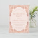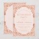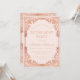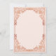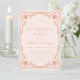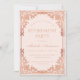 Esta elegante invitación de fiesta de jubilación en rosa y dorado con aire vintage, recomendada para una mujer, tiene un marco de lámina de oro rosa (falso) ornamentado con decoraciones barrocas elegantes sobre un fondo rosa pálido. El nombre está escrito en caligrafía elegante. Todo el texto se puede personalizar y tiene un color rosa similar al marco de oro rosa.
