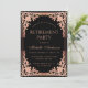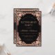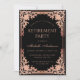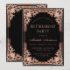 Esta elegante invitación a una fiesta de jubilación en negro y rosa (dorado rosa) con aire vintage, recomendada para una mujer, tiene un marco de lámina de oro rosa (falso) ornamentado con decoraciones barrocas elegantes sobre un fondo negro. El nombre está escrito en caligrafía elegante. Todo el texto se puede personalizar y tiene un color rosa similar al marco de oro rosa.