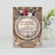 Diseño romántico y trendy con flores de color burdeos en acuarela, esquinas de encaje rústico vintage, barril de vino y luces de cuerda; en la parte posterior iniciales y ramo floral, todo sobre fondo de granero antiguo. Utilice la herramienta Personalizar para agregar su información. Para artículos coincidentes, visite mi Colección de Fiestas de Jubilación.