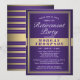 Si las circunstancias impiden la celebración habitual, ¡conéctate con la familia y amigos desde una distancia segura con un elegante fiesta jubilatorio que conduce o conduce hacia adelante! Todo el texto de esta plantilla es sencillo de personalizar para un desfile de coches de distanciamiento social o evento de videoconferencia con zoom virtual con chat en línea. También es posible incluir un mensaje personal si es necesario debido a una cancelación o postergación. El diseño morado, blanco y dorado presenta un fondo oscuro moderno, rayas y bordes Relieves metalizados falsos, caligrafía de escritura elegante y tipografía de inspiración Art Déco. Tenga en cuenta que el oro es color impreso, no Relieve metalizado metálico. Esta plantilla de invitación está configurada para una jubilación, pero también puede ser para un fiesta que se vaya.