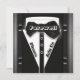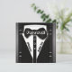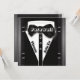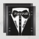 Invitaciones a eventos formales y fiestas de cumpleaños de moda, frescas y elegantes con plantillas de texto de personalizable. DISEÑO - Un elegante fondo gris de metal negro y blanco enmarca un esmoquin negro y blanco con corbata de arco.