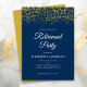 Esta invitación a la fiesta de retiro incluye confetti purpurina de oro falso en fondo azul oscuro y acento con texto de escritura elegante.