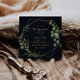 Esta invitación geométrica a la fiesta de retiro verde de oro azul es perfecta para una simple celebración. El diseño está decorado con hermosas hojas verdes pintadas a mano en un fondo azul oscuro, adornando un marco geométrico dorado.