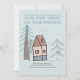 Invitaciones para fiestas de cambio de hogar con dibujo de doodle casero de bosque y tipografía decorativa. El dibujo de los medios mixtos tiene una casa acogedora, pinos y un pequeño pájaro en una agradable paleta de colores verde, rubia, marrón y gris. La frase dice "por favor únanse a nosotros para un fiesta de limpieza en nuestro nuevo cuello del bosque" junto con los detalles de sus invitaciones.