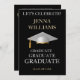 Fiesta de la Celebración del Graduado Invitación de Oro y Blanco. Reúne amigos y familia para celebrar un graduado especial. Esta tarjeta está diseñada en blanco y dorado brillante sobre un fondo negro con un acento de tapón blanco. El texto principal incluye: el nombre del graduado y la Clase de Año. El texto inverso incluye: los detalles del fiesta en oro y blanco sobre un fondo negro con el acento del tapón de grad blanco. Para personalizar, simplemente inserte sus detalles de texto en nuestra plantilla sencilla, reemplazando el ejemplo.