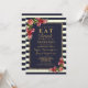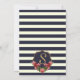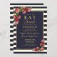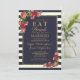 Elegante, moda y rosas rojas y rosas de campo con rayas azul marino y marfil blancas y fino dorado impreso delineado, invitaciones a la fiesta de compromiso. Este diseño clásico y sofisticado es perfecto para una pareja casera elegante, moderna y elegante. Personalice con su propio mensaje en la parte delantera y un monograma personalizado en la parte posterior. Todo el diseño de impresión fotográfica.
