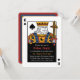 Esta invitación caprichosa y divertida marca el tono casual para el fiesta de la noche de póquer! La invitación está diseñada como una carta de rey de la espada donde el rey de la espada se aferra a una botella de cerveza y una espada que está atravesando una porción de pizza. ¡Oye, incluso un rey necesita refrescarse y relajarse! Disfrute de una noche llena de diversión con juegos de cartas de póquer, comida y bebidas! La página inversa utiliza elementos similares de la parte delantera dispuestos para que se parezca a la parte trasera de una carta de juego. Personalice los detalles de su fiesta en el espacio negro que se proporciona.