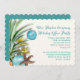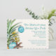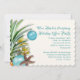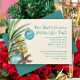 Invitaciones de grupos de Navidades de oficina con un tema de luau hawaiano. El texto azul Aqua es fácil de personalizar en dos lugares con un guión grande en la parte superior para el nombre de la empresa. Utilícelo para un fiesta de oficina, un fiesta en el hogar u otro evento estacional. El color del papel blanco roto está decorado con una estrella de mar, piña y flores frangipanas. Los adornos azules de Aqua añaden un toque más Navidad. Un patrón de piñas cubre la parte posterior del papel sobre un azul bonito. El borde colopado es una opción, con muchas otras.