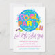 Fiesta de la Piscina de Verano, Fiesta de la Piscina Fuera de la Escuela letras de colores vivos sobre un fondo blanco hacen de esta invitación de fiesta una atracción y diversión! Agregue los detalles de su fiesta mediante el formulario de plantilla. Se puede agregar texto adicional al reverso si es necesario utilizando la función Personalizar.