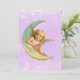 Invitación de un fiesta de lectura de tarot. Puedes personalizar a cualquier ocasión que estés organizando. Un dibujo de cosecha dulce. Un ángel pacífico parecido a un niño que descansa en la curva de una luna creciente sobre un marco de suave espliego burbujeante con un fondo rayado en morado.