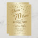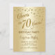 Invitación a la fiesta de cumpleaños 70 para mujeres y hombres. Elegante diseño con un falso efecto de Relieve metalizado dorado purpurina. Presenta el tipo de letra del guión y el perfil. ¡Saludos a 70 años! Perfecto para una elegante celebración de cumpleaños.