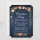 Elegante acuarela Poinsettia Floral Navidades Party Invitación incluye hermosas poinsettias rojas acuarelas, vegetación botánica, follaje de invierno, bayas huecas, rosas blancas, algodón, pinos y bayas azules. Madera Azul Rústica.