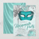 Invitaciones de fiesta de máscara azul turquesa con hermosa máscara de máscara azul turquesa y diamantes plateados con joyas en un elegante fondo azul turquesa y plateado. Esta hermosa invitación de fiesta de máscara se personaliza fácilmente para su evento simplemente agregando sus detalles en el estilo de fuente, diseño y redacción de su elección.