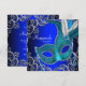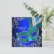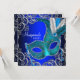 Hermosa invitación de fiesta de máscaras azul real, máscara de plumas azul cian plateado y azul cian. Esta elegante invitación de fiesta de máscaras azul cian se personaliza fácilmente para su evento agregando los detalles del evento, estilo de fuente, tamaño y color de la fuente y redacción.
