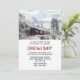 Una invitación a una fiesta de Navidad con una fotografía de un paisaje invernal nevado con pinos cubiertos de nieve. Un tren antiguo rojo, dorado y negro que viaja por el desierto. Evoca pensamientos de volver a casa para Navidad.