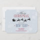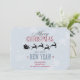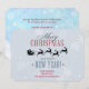 Una invitación festiva de fiesta de Navidad. Un sutil fondo gris azulado con copos de nieve. Letra elegante y moderna que dice: Feliz Navidad y Feliz Año Nuevo. Con una silueta negra de Santa montado en su trineo tirado por sus renos volando por el cielo.