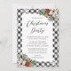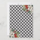 Invitación de chapa de búfalo blanco y negro con poinsettia blanca, holly, bayas rojas, copos de nieve y estrellas.