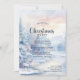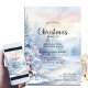 Invite a sus amigos y familia a la celebración de sus Navidades este año con esta invitación que incluye una escena de invierno con pinos llenos de nieve al lado de un lago, y se puede ver a un ciervo entrando en el claro.